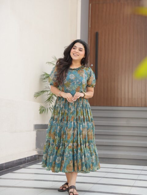 Frock Work Floral Print And Foil Print With Lace Touch Up