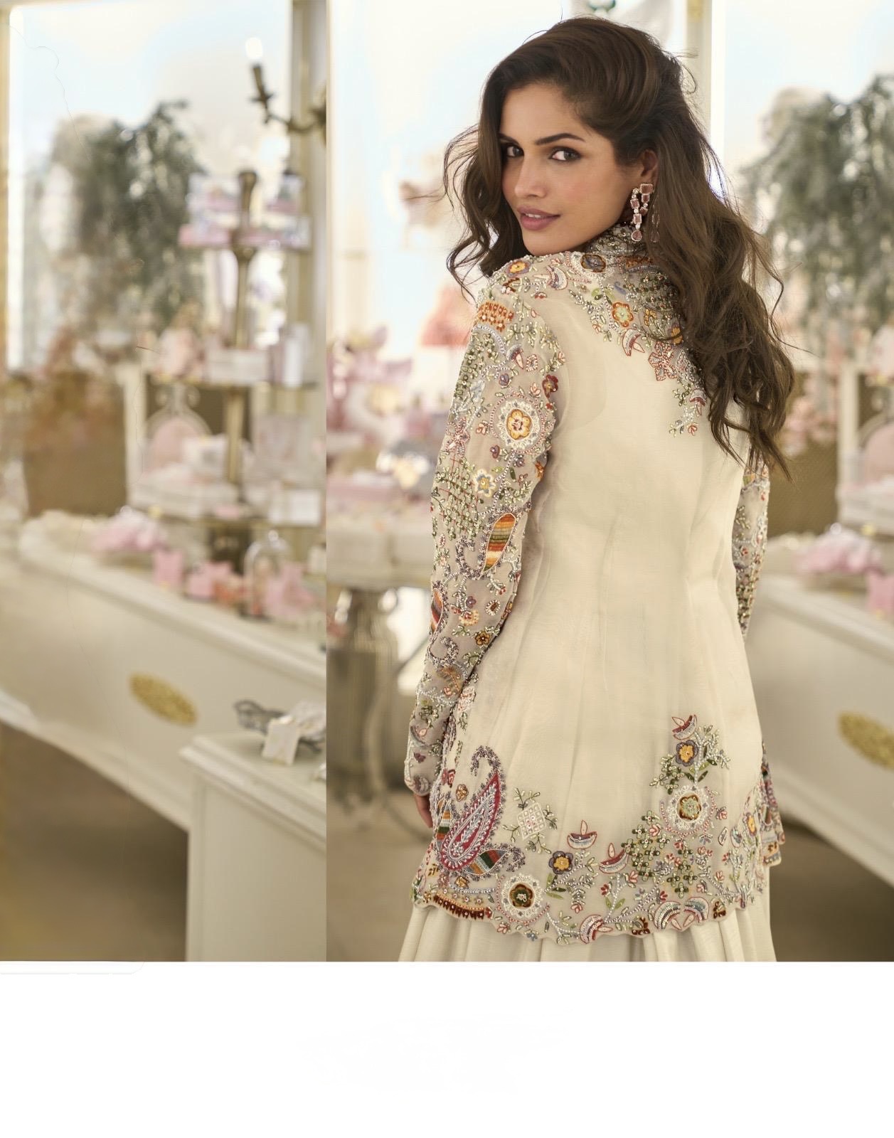 FABRIC PREMIUM REAL SILK STYLIST WEDDING FULL HEAVY LOOK BEADS EMBROIDERED FRONT AND BACK WORK JACKET WITH SILK GOWN