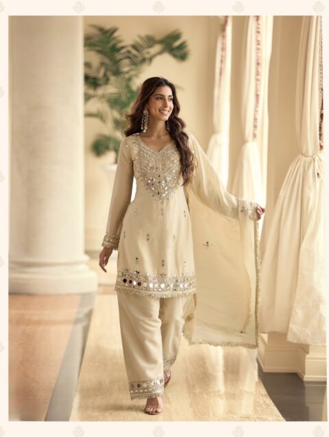 FABRIC PREMIUM SIMAR SILK TORA SILK CREP SILK ( LATEST TRENDY HAND ORIGNAL MIRROR EMBROIDERED TOP WITH PLAZZO AND DUPATTA )