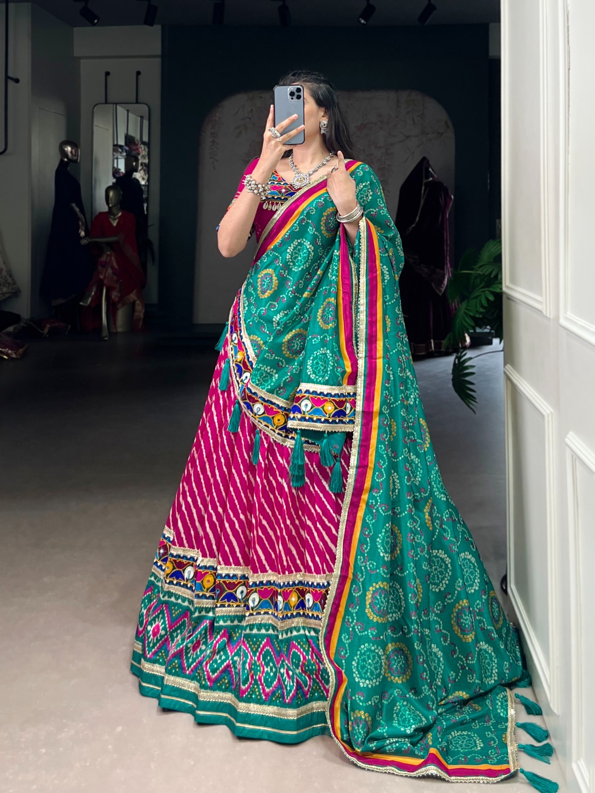 Lehenga Work Leheriya With Patola Print Border And Real Mirror Gamthi Work With Lace Touch Up